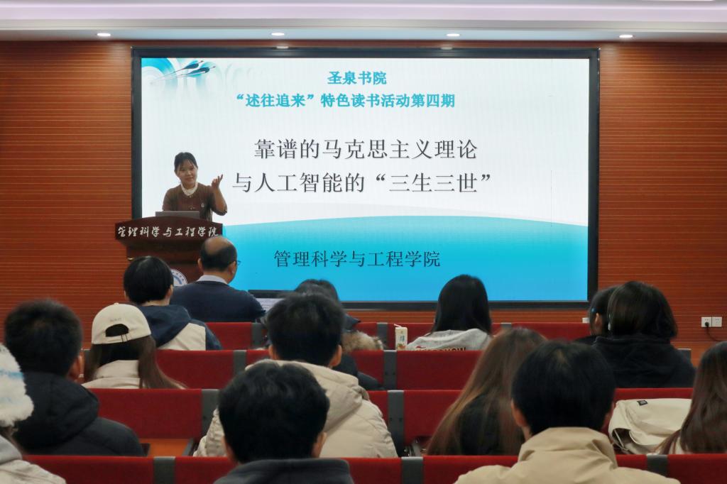 12月11日,管理科学与工程学院圣泉书院第四期“述往追来”特色读书会在圣井校区举行。本期活动主题为“马克思主义理论与人工智能的‘三生三世’”,大数据管理与应用系党支部书记、系副主任王会东,学生第四党支部书记、“多触角两栖式”辅导员素质能力提升工作室主持人冯婧担任领读人。大数据管理与应用专业2022级、2023级、2024级近60名同学参与读书活动。