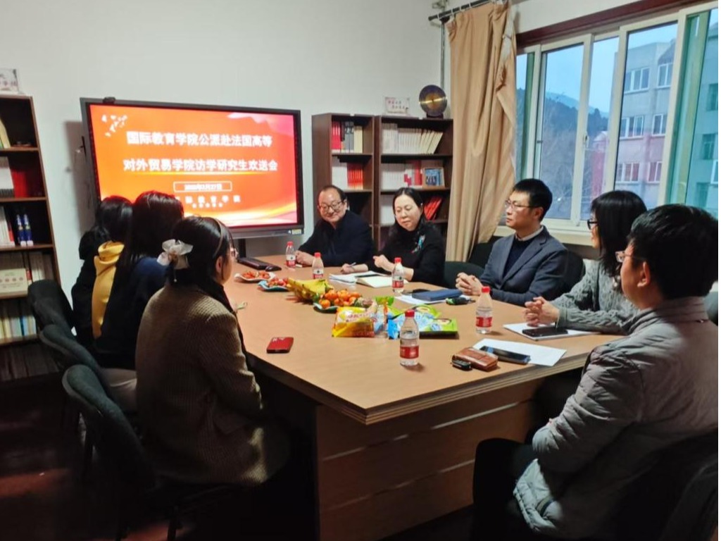 2月28日,国际教育学院举行欢送会,欢送即将远赴法国高等对外贸易学院访学的研究生。学院党委书记张红燕、院长杨春晓、党委副书记王伟、院长助理王英杰,教授赵迎、青年教师逄思佳及三位赴法研究生参会。