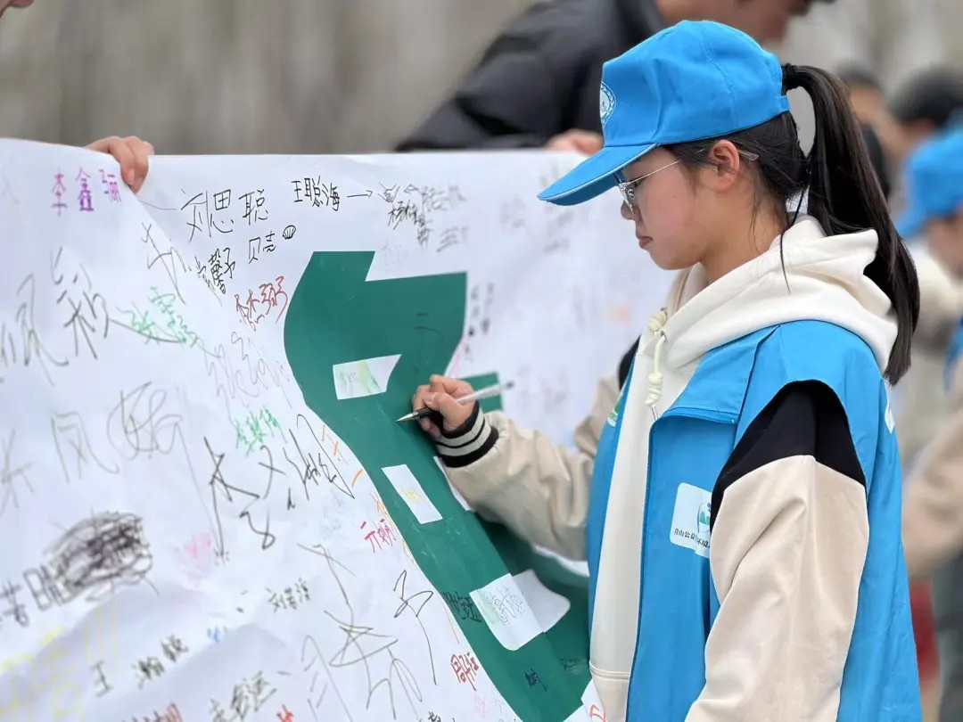 植树结束后,在绿块公益的图南老师讲解下,同学们一起学习了《黄河生态文明十条》,并在绿色低碳行动条幅上郑重签下了自己的名字。