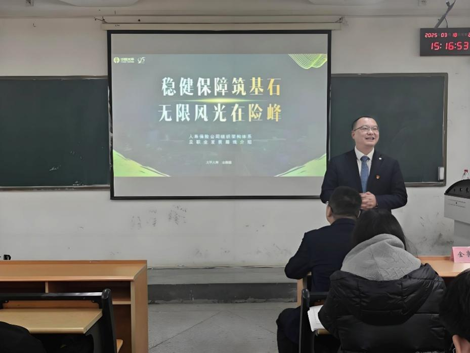 金鲁强以“稳健保障筑基石 无限风光在险峰”为主题,介绍人寿保险公司组织架构体系及职业发展路线。他从保险公司概况和经营模式入手,分析了太平保险“专注国际级优质资源”的投资渠道优势,进一步阐述了人寿保险公司的组织架构体系及员工职业发展路线,并为同学们展示了“之”字型人才职业发展路径的全新视角。他回顾了中国太平人寿保险有限公司的品牌历史与发展战略,展示了中国太平在“荣耀与挑战共舞”的发展道路上所取得的成就。