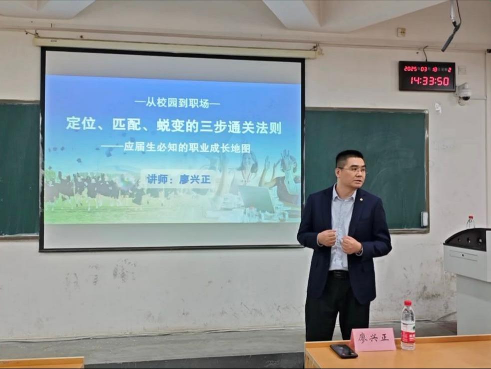 廖兴正围绕“定位”“匹配”“蜕变”三个环节,首先强调“定位”的关键意义,分析个人的工作价值观,以九种职场人格为例,引导学生深入探索自我,找到自己的“职场指南针”。在“匹配”环节,他指出需从企业分类以及企业发展各阶段对人才需求入手,洞察和看懂企业的“生命周期”,深入了解企业文化,选对自己的发展赛道。在“蜕变”环节,他提出要认真剖析学生与职场人的区别,实现从学生思维到职场人思维的转换,鼓励学生摒弃被动等待任务的习惯,主动发现并解决问题,学会团队协作与利益交换,接受工作中的灰度决策。他详细阐述了骨干进阶三部曲,即“站稳—冒尖—带队”,提出要避免“职场电池”报废,通过不断技能更新和磨砺管理能力提高职场续航力。