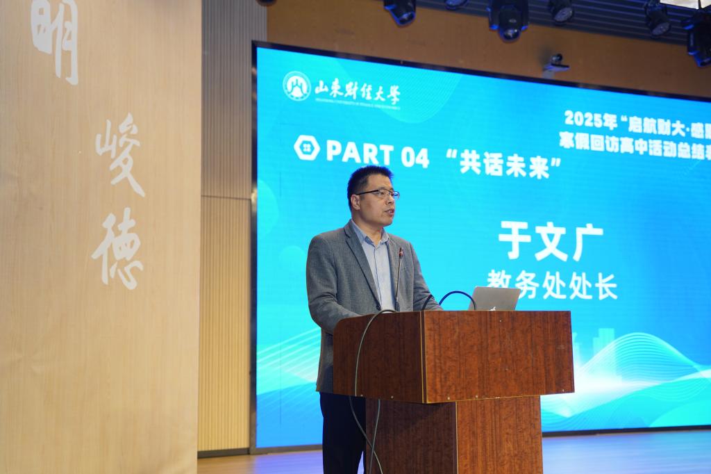 于文广在总结讲话中高度肯定了回访活动的重要意义。他指出,通过此次回访活动,上千名山东财大学子以“过来人”的身份,架起了与全国各地高中学子双向对话的桥梁,为他们的青春选择提供了一个名为山东财经大学的“答案”。他强调,我们要将这份实践成果进一步转化为育人体系创新的澎湃动能,形成“三维立体化”育人新格局。一是建立长效机制,构建“回访-培育-反哺”闭环;二是创新协同机制,打造由专业教授、招办老师、优秀学子组建的三阶赋能共同体;三是强化数字赋能,创新智慧传播矩阵,利用现代科技手段提升宣传效果和覆盖面。