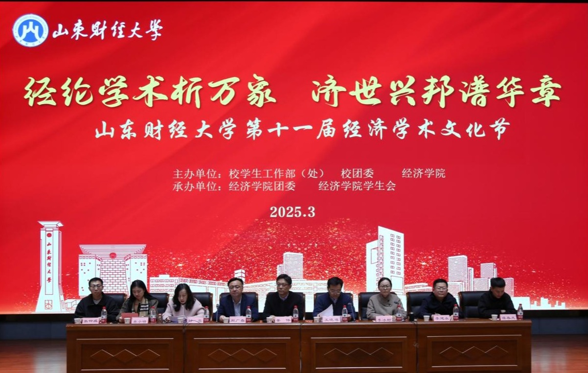 3月27日,由学生工作部(处)、校团委和经济学院主办,经济学院团委、学生会承办的“经纶学术析万象 济世兴邦谱华章”山东财经大学第十一届经济学术文化节开幕式在章丘校区图书馆报告厅举行。经济学院党委书记姜伟、校团委书记王晓迪、学生工作处副处长周广春、经济学院党委副书记李冰封出席开幕式。开幕式由经济学院团委书记付雯主持。经济学院全体辅导员,学院第十三届学生会及学生组织全体成员和2024级学生参加开幕式。