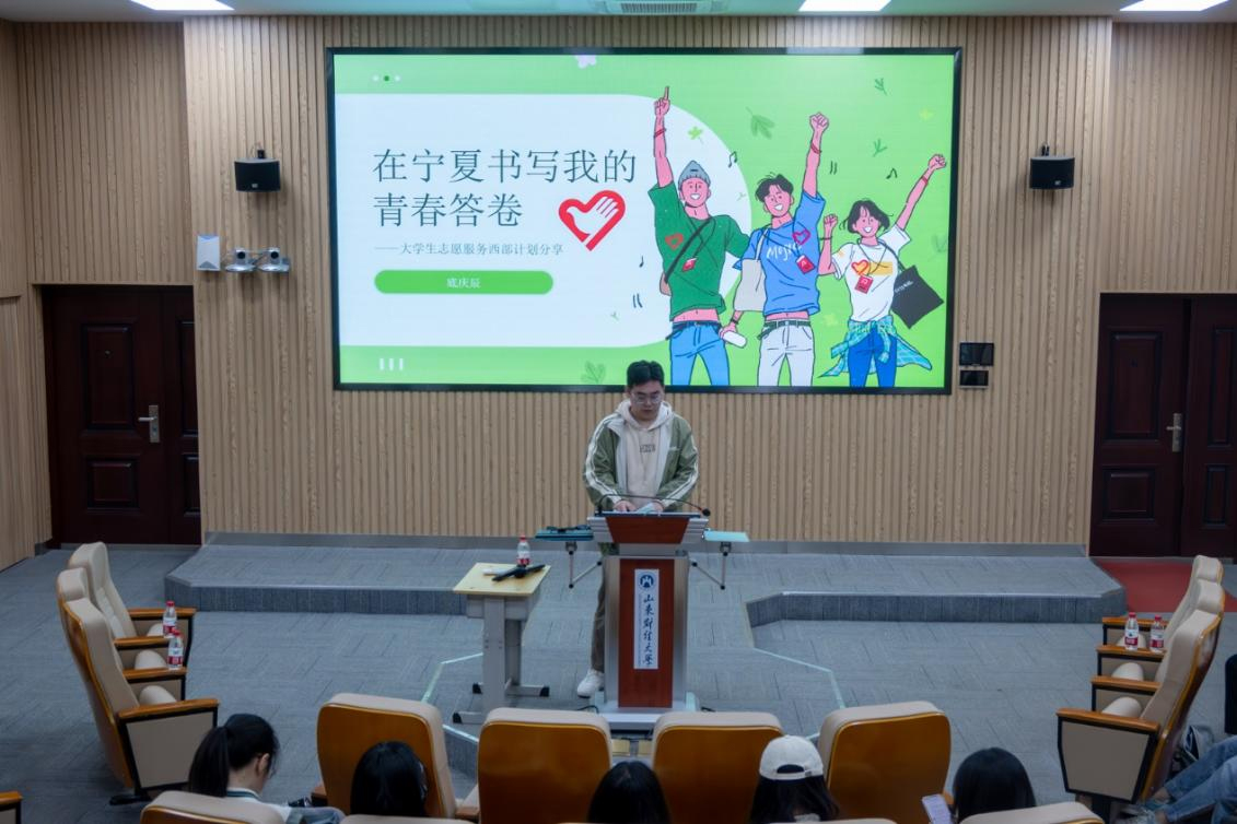 底庆辰以“在宁夏书写我的青春答卷”为题,讲述了自己在服务过程中克服困难、融入当地生活以及在工作中实现个人价值的真实故事,从第一视角带领大家感受自己的西部计划经历,以真实动人的故事引发全场同学的共鸣。