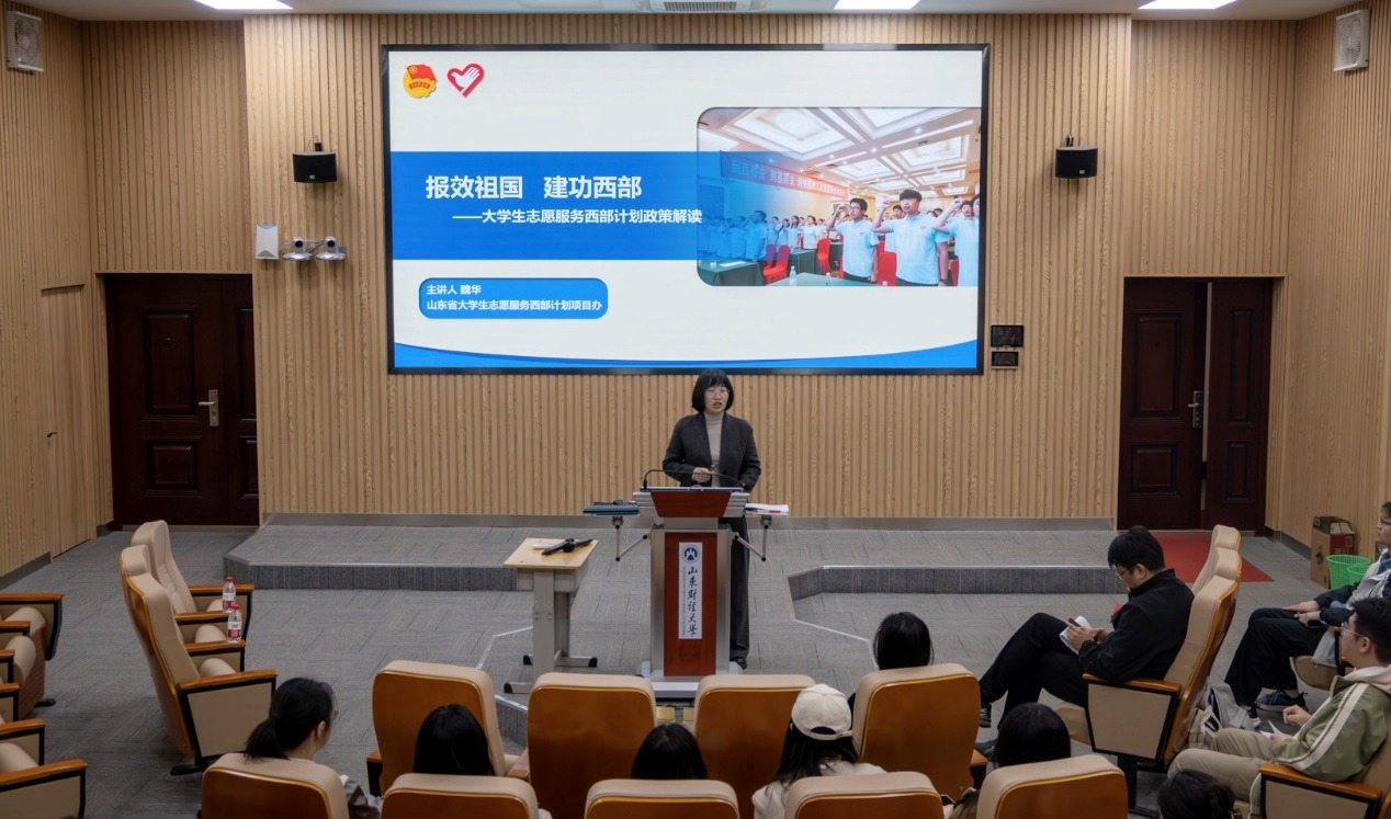 魏华以“报效祖国 建功西部——大学生志愿服务西部计划政策解读”为题,围绕“项目介绍”“实施内容”“组织方式”“政策保障”“发展优势”五个方面,对大学生志愿服务西部计划的全国项目与山东项目进行深入解读,结合政策解读与真实案例,鼓励大学生将个人理想与国家发展紧密结合,在祖国最需要的地方绽放青春光彩。