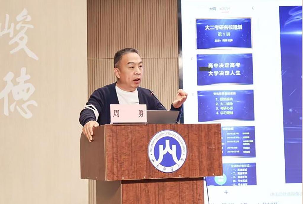 4月10日,会计学院在章丘校区举办“学海扬帆·研路筑梦”学风建设主题讲座。讲座特邀全国著名考研指导专家,清华大学、北京大学创业导师周勇担任主讲人。学院党委副书记张贞梅主持,400余名学生现场聆听讲座。