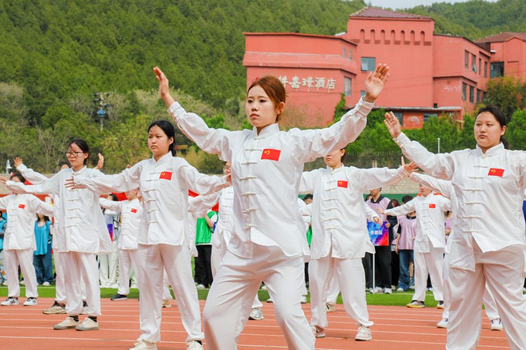 今年的开幕式特别增加了健身气功八段锦的汇报表演。为积极响应学校“以体育智、以体育心”的体育教育宗旨,继续教育学院从本学期开始为出国留学项目学生开设了八段锦、太极拳等特色体育课程。此次汇报表演由2024级2+2项目学生代表精彩呈现。他们身着飘逸的白色太极服,在悠扬舒缓的伴奏音乐中,动作行云流水、整齐划一、仿佛将一幅灵动的水墨山水画搬上舞台,充分展现了传统体育文化的独特魅力与学院体育教育的教学成果。