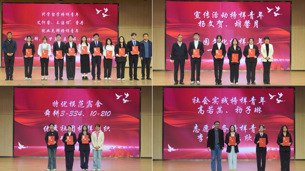 在五四榜样青年颁奖环节,领导、老师们为在学术科研、志愿服务、社会实践等领域表现突出的多名优秀青年学子进行颁奖。