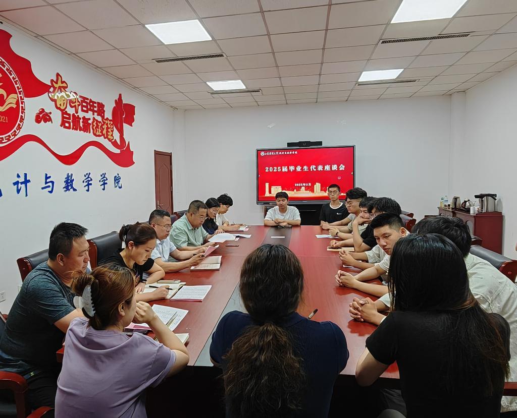 5月30日下午,统计与数学学院2025届毕业生代表座谈会在舜耕校区召开。学院党委书记安起光、院长田金方参加会议并与同学们座谈交流。学院党委副书记李云枝主持座谈会。