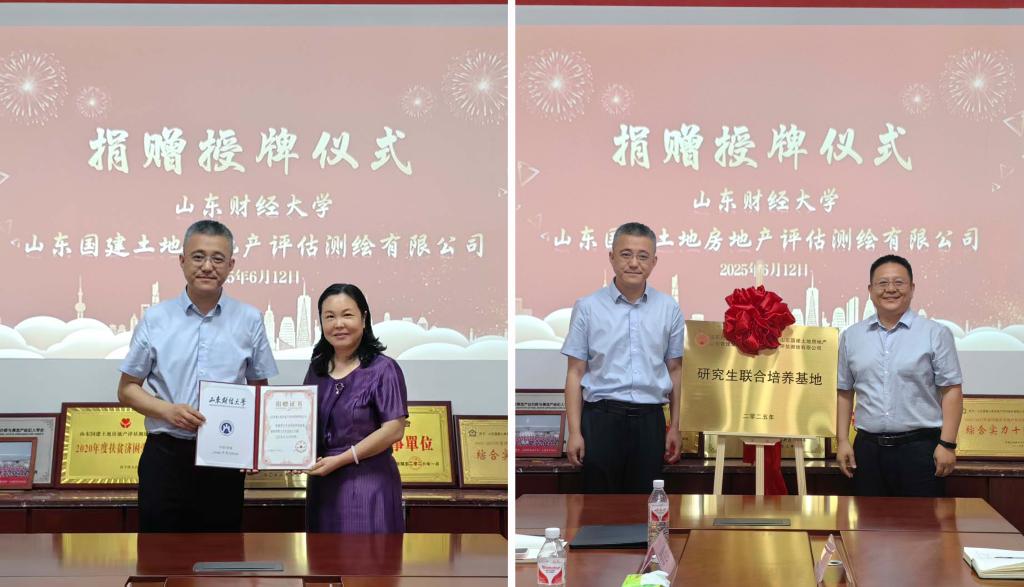 会上,田远向山东国建土地房地产评估测绘有限公司颁发捐赠证书,为许燕霞、邓振利、赵立志颁发硕士研究生合作导师聘书。田远、邓振利代表双方签署研究生联合培养基地协议,共同为“山东财经大学研究生实践教学基地”揭牌。根据协议,双方将聚焦土地管理专业,在教学实践、案例研发、科研创新、教育培训、智库建设等领域开展全方位合作,构建协同育人新格局,力争打造校企合作新典范。