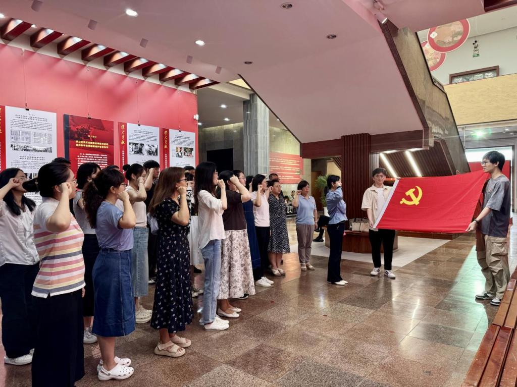 参观结束后,学院党委副书记吕晓燕带领全体师生党员重温入党誓词。全体党员面对鲜红的党旗,庄严举起右拳,在铮铮誓言中追忆入党初心,唤醒那份最初的信仰与热忱,完成对自己初心的致敬和对党的深情礼赞,也在誓言中汲取精神力量,坚定砥砺前行的信念。