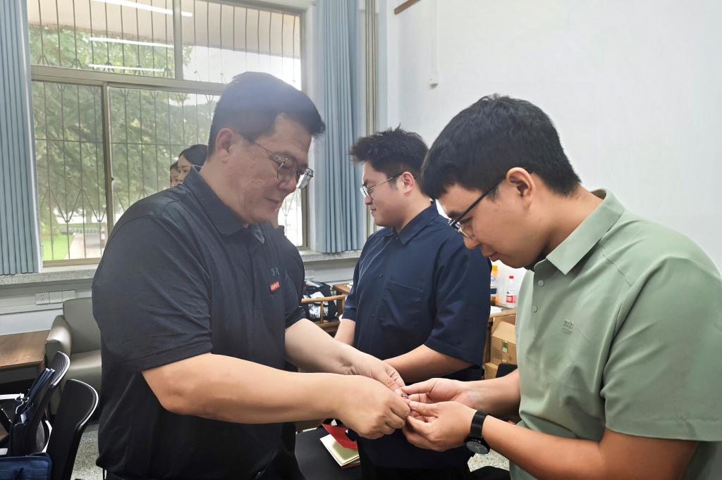 杨哲为每位新入职辅导员佩戴校徽。新入职辅导员依次发言,结合个人经历、工作设想进行了自我介绍,并纷纷表示无比自豪能够成为学校育人队伍的一员,未来将勇担重任,肩负起为党育人、为国育才的光荣使命。