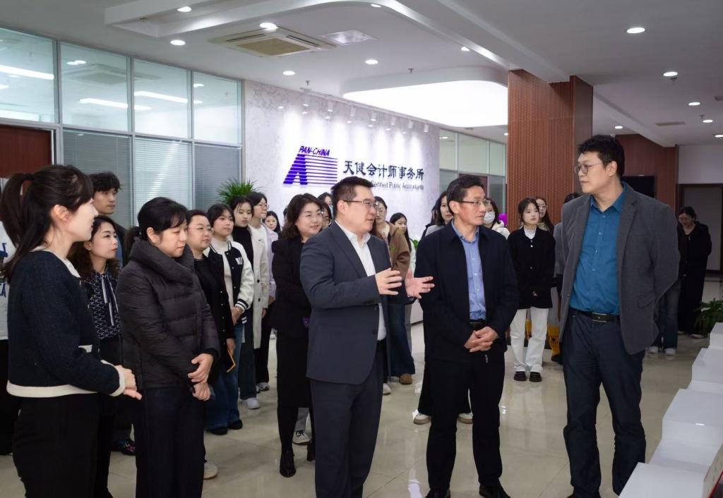 师生一行首先实地参观了事务所的办公区域。规整有序的办公布局与专业高效的工作场景相得益彰,让学生直观感受到会计师事务所的职业生态,对行业工作场景与业务运转模式建立起具象认知。