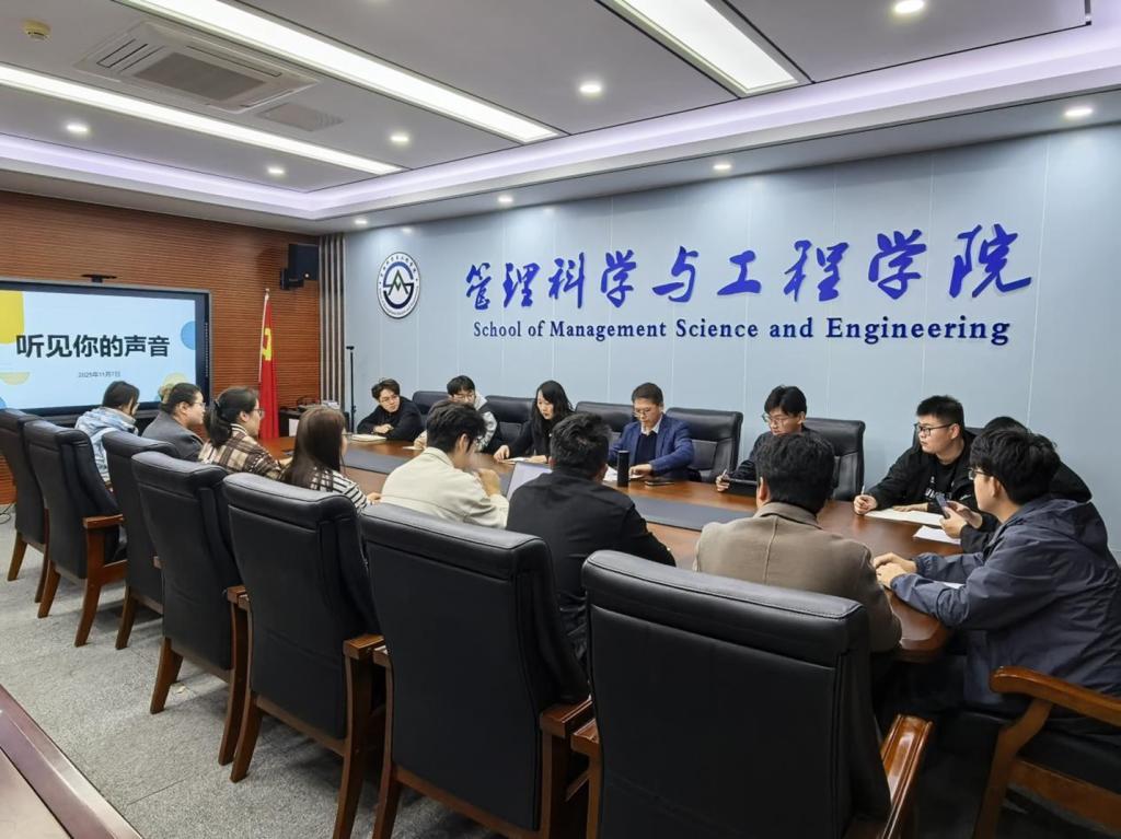 11月7日,管理科学与工程学院书记院长茶座系列活动之“研途解惑 共话成长”研究生座谈会在章丘校区召开。副院长刘政敏、团委书记何丽与2025级部分研究生代表齐聚一堂,面对面沟通交流。座谈会由何丽主持。