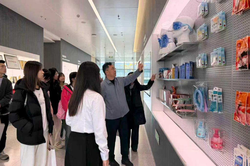 师生首站抵达英科医疗张店厂区,在企业招聘专员陪同下,参观了企业展厅、办公楼及生产车间,近距离观摩医疗器械及耗材的研发制造流程,切身感受高科技企业的创新活力与国际化运营特色。工作人员介绍了企业在医疗器械、环保再生资源领域的行业地位、技术优势及人才培养机制,并表达了与学院深化合作的意愿,希望共同推动人才精准对接,探索产教融合新路径。