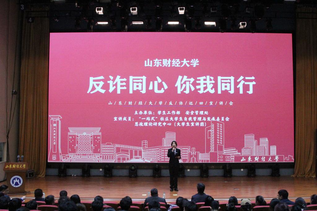 11月20日下午,“反诈同心 你我同行”反诈巡回宣讲会暨反诈宣传员聘任仪式在章丘校区图书馆报告厅举行。学生工作部部长杨哲、安全管理处处长王福滨出席活动并讲话。