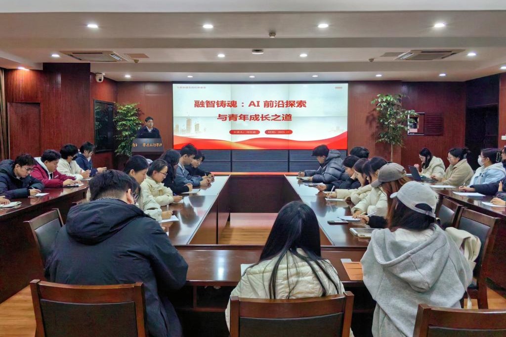 授课中,刘培德以“技术赋能与价值引领双向发力”为核心,从AI技术发展脉络、前沿应用场景与未来趋势展开系统分享,用深入浅出的语言,生动解析了生成式AI、大数据建模、智能决策等核心技术在金融科技、数字治理等领域的创新实践,让在场学子对AI技术的应用价值有了直观且深刻的认识。刘培德强调,AI技术作为新时代的“核心生产力”,既是助力青年成长成才的“赋能器”,也是检验青年责任担当的“试金石”,青年党员应主动拥抱技术变革,在时代浪潮中找准定位。