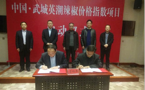 近日,中国武城英潮辣椒价格指数项目启动仪式在德州市武城县举行,中椒英潮集团公司与山财大指数与大数据研究院签订中国武城英潮辣椒价格指数项目研究合作协议。山东财经大学统计学院院长石玉峰、党委书记姜伟、山东省物价检测中心主任王鲁岳、德州市物价局局长于喆、武城县县长张磊、中椒英潮集团公司董事长谭英潮参加了此次启动仪式。