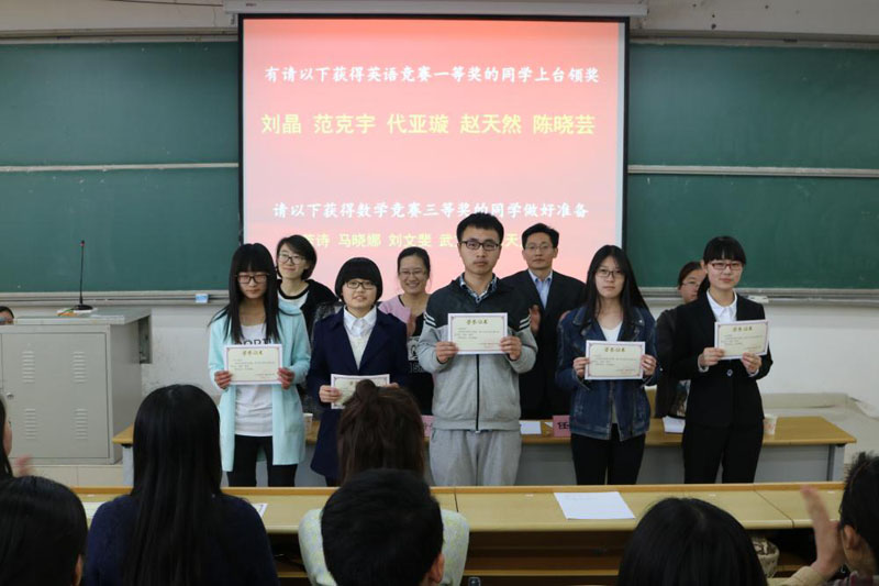 3月21日,经济学院第一届大学生英语、数学竞赛颁奖典礼于圣井校区敏行楼B5-301教室举行。经济学院党委副书记任海伦,院团委书记兼学工办主任周新秀,辅导员裴斐、王琦老师出席典礼。获奖同学和经济学院14、15级各班学生参加,颁奖典礼由周新秀主持。