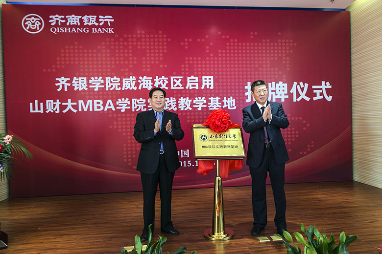 12月19日,山东财经大学MBA学院、齐商银行实践教学基地揭牌仪式在威海举行。山东财经大学MBA学院院长陶虎、山东财经大学兼职教授、工商管理硕士导师、齐商银行党委书记、董事长杲传勇等有关人员出席仪式。陶虎和杲传勇共同为山东财经大学MBA实践教学基地揭牌。