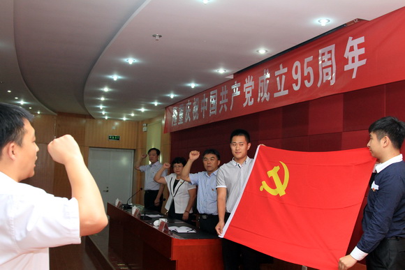 会议伊始,全体人员起立高唱《国歌》,并面对鲜红的党旗重温了入党誓词。