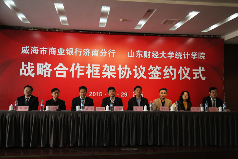 10月29日下午,山东财经大学统计学院与威海市商业银行济南分行战略合作框架协议签约仪式在学景大酒店学术交流中心隆重举行。威海市商业银行济南分行副行长谢磊、中国人民银行济南分行营业管理部党委委员、工会主任刘向群、营业管理部货币信贷统计处处长窦重田、营业管理部征信管理处处长朱玲以及两行相关负责人出席了仪式,统计学院院长石玉峰、党委书记姜伟、副书记赵世民及学院研究生、2013级全体本科生参加签约仪式。仪式由赵世民主持。