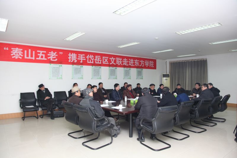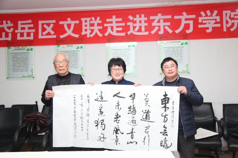1月11日,东方学院校内风清气爽,文墨飘香。“泰山五老”新春笔会暨岱岳区文联“书画家训 德润人心”活动在此开展,“泰山五老”傅汝有、董绪忠,岱岳区文联主席张建平,岱岳区文联美术家协会主席李光富,岱岳区书法家协会主席李向阳,徂徕书院院长、区职业教育中心工会主席宋其圣等十余位书画家挥毫泼墨,即兴创作出一幅幅寄托着对东方学院美好祝福的书画作品。
