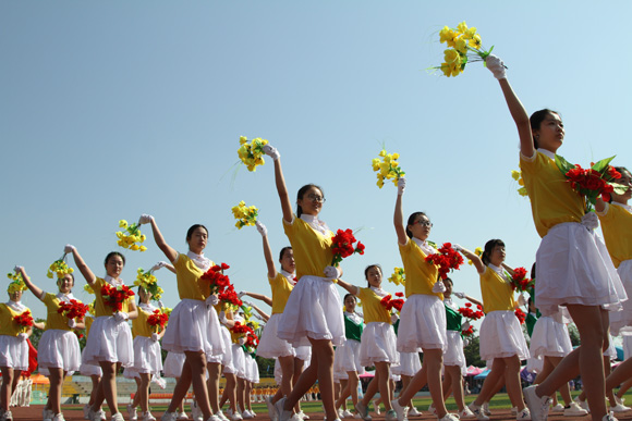 花瓣捧在手里,笑意盈漾在脸上,300余名同学组成的团体操表演绘成五瓣旋转的金花,在阳光底下翩翩舞动,舞出飞扬的青春,为运动会的顺利举办献上祝福。