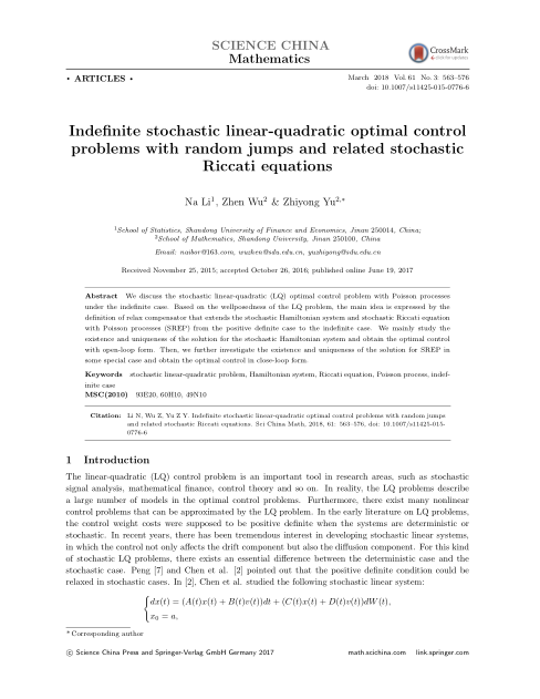 近日,我校统计学院青年博士李娜副教授以第一作者撰写的高水平学术论文《Indefinite stochastic linear-quadratic optimal control problems with random jumps and related stochastic Riccati equations》在《中国科学》英文版《Science China Mathematics》2018年第61卷第3期上发表。
