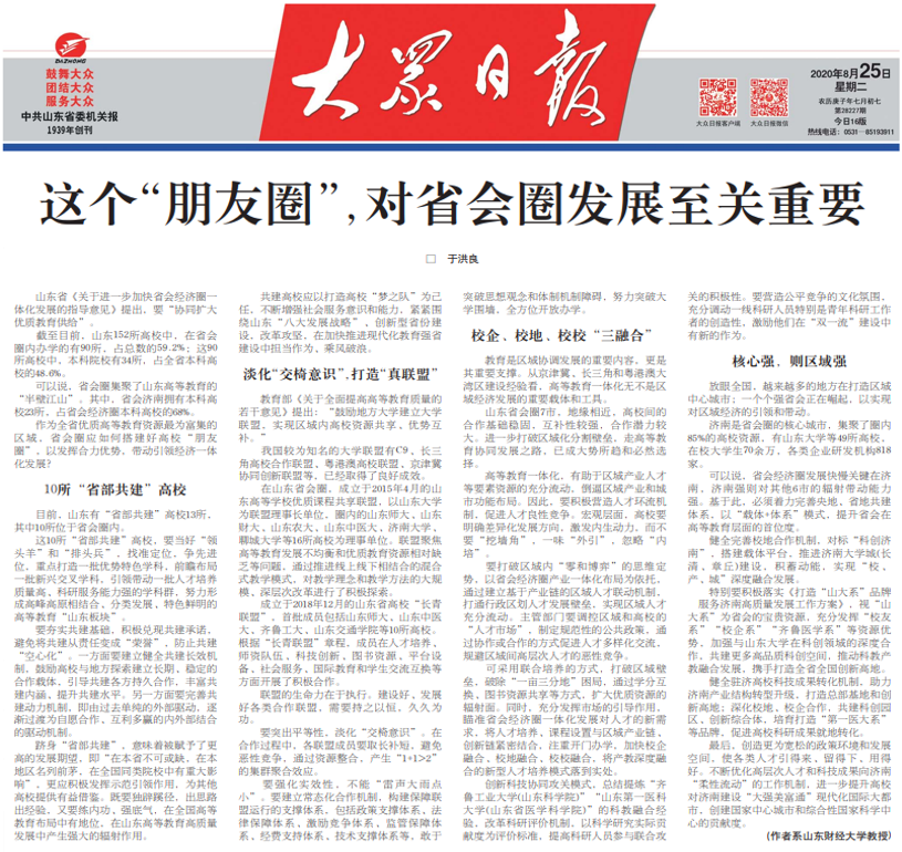 可以说,省会经济圈发展快慢关键在济南,济南强则对其他6市的辐射带动能力强。基于此,必须着力完善央地、省地共建体系,以“载体+体系”模式,提升省会在高等教育层面的首位度。