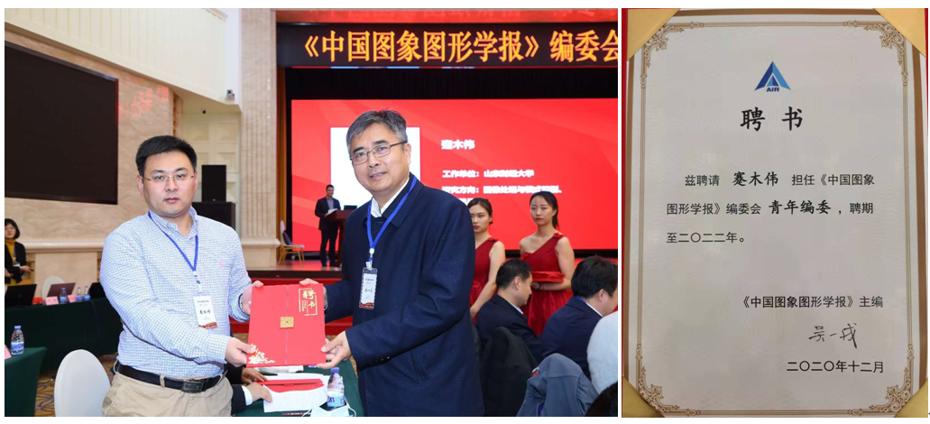 近日,《中国图象图形学报》编委会换届工作会议在北京西郊宾馆召开。中国科学院院士吴一戎研究员为新任编委颁发聘书,我校计算机科学与技术学院蹇木伟教授应邀担任《中国图象图形学报》青年编委,系我省省属高校唯一的入选者。