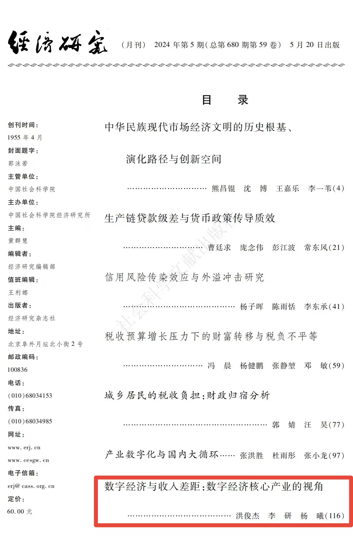 我校洪俊杰教授与对外经济贸易大学博士研究生李研和杨曦合作撰写的论文《数字经济与收入差距:数字经济核心产业的视角》在《经济研究》2024年第5期发表。该刊为我校特类期刊。