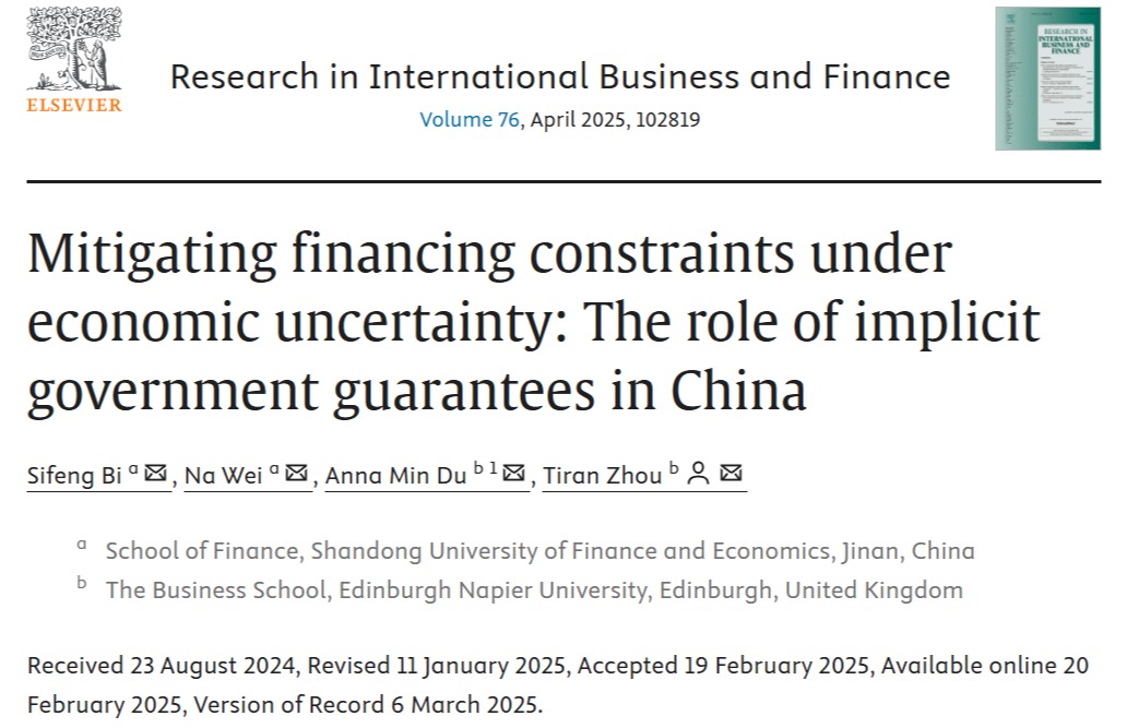金融学院毕泗锋教授作为第一作者与硕士生魏娜,英国Edinburgh Napier University的Anna Min Du教授、Tiran Zhou助理教授合作的论文“Mitigating financing constraints under economic uncertainty: The role of implicit government guarantees in China”在期刊《Research in International Business and Finance》2025年第76卷(Volume 76,April 2025,102819)发表。该期刊为SSCI一区期刊,期刊最新影响因子为6.3,属我校A1类期刊。