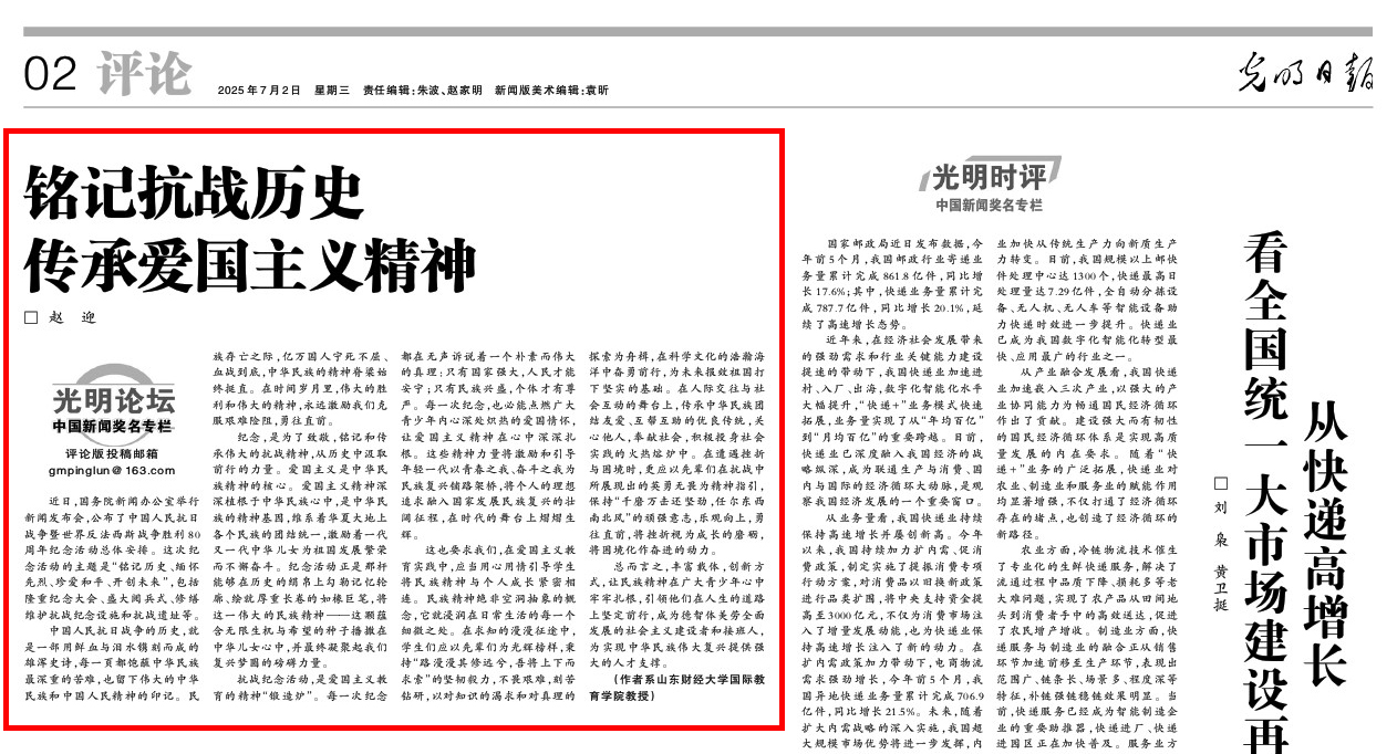 7月2日,国际教育学院赵迎教授撰写的文章《铭记抗战历史 传承爱国主义精神》在《光明日报》评论版(02版)“光明论坛”栏目发表。