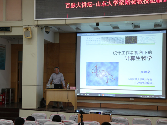 5月5日下午3:30,由统计学院举办的“百脉大讲坛”第十五讲在山东财经大学燕山校区第三报告厅开讲,山东大 学数学学院应用数学研究所所长栾贻会应邀作题为"计算生物学——统计工作者的视角"的专题报告。本次讲座由统计学院副院长赵霞主持,很多感兴趣的研究生, 本科生特来聆听此次讲座。