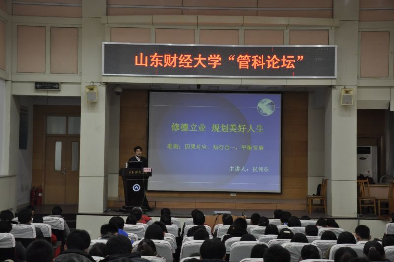 12月6日下午,由管理科学与工程学院主办的“管科论坛”在燕山校区三号教学楼学术报告厅举行,济南科技市场管委会主任、党委书记祝伟东做了题为“修德立业,规划美好人生”的报告。解放路劳动保障服务中心马继海主任,济南科技市场有限公司副总经理石磊,管理科学与工程学院党总支书记高康林、副书记杨德嵋以及120余名本科生、研究生参加报告会。报告会由管理科学与工程学院院长张新主持。