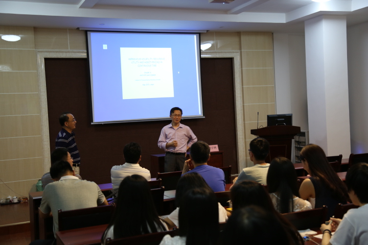 本次报告的题目为“AMBIGUOUS VOLATILITY, RECURSIVE UTILITY AND ASSET PRICING IN CONTINUOUS TIME”。报告伊始,嵇教授向大家介绍了现代金融理论的发展,强调了数学模型的重要性,认为其可以改变金融市场的格局,并反思金融危机,指出其根源是模型的不确定性。接下来,由不确定性理论的局限性引出了对理论的重大突破——非线性期望理论,以此对传统理论进行修正。基于修正的理论,嵇教授建立了波动率不确定条件下的资本资产定价公式,并借助均衡理论完善了该理论。整场讲座中,嵇少林教授结合其最新研究成果,以扎实的理论基础和缜密的公式推导向听众展示了学术的魅力,引人深思。讲座气氛良好,交流讨论热烈,在场同学受益良多。
