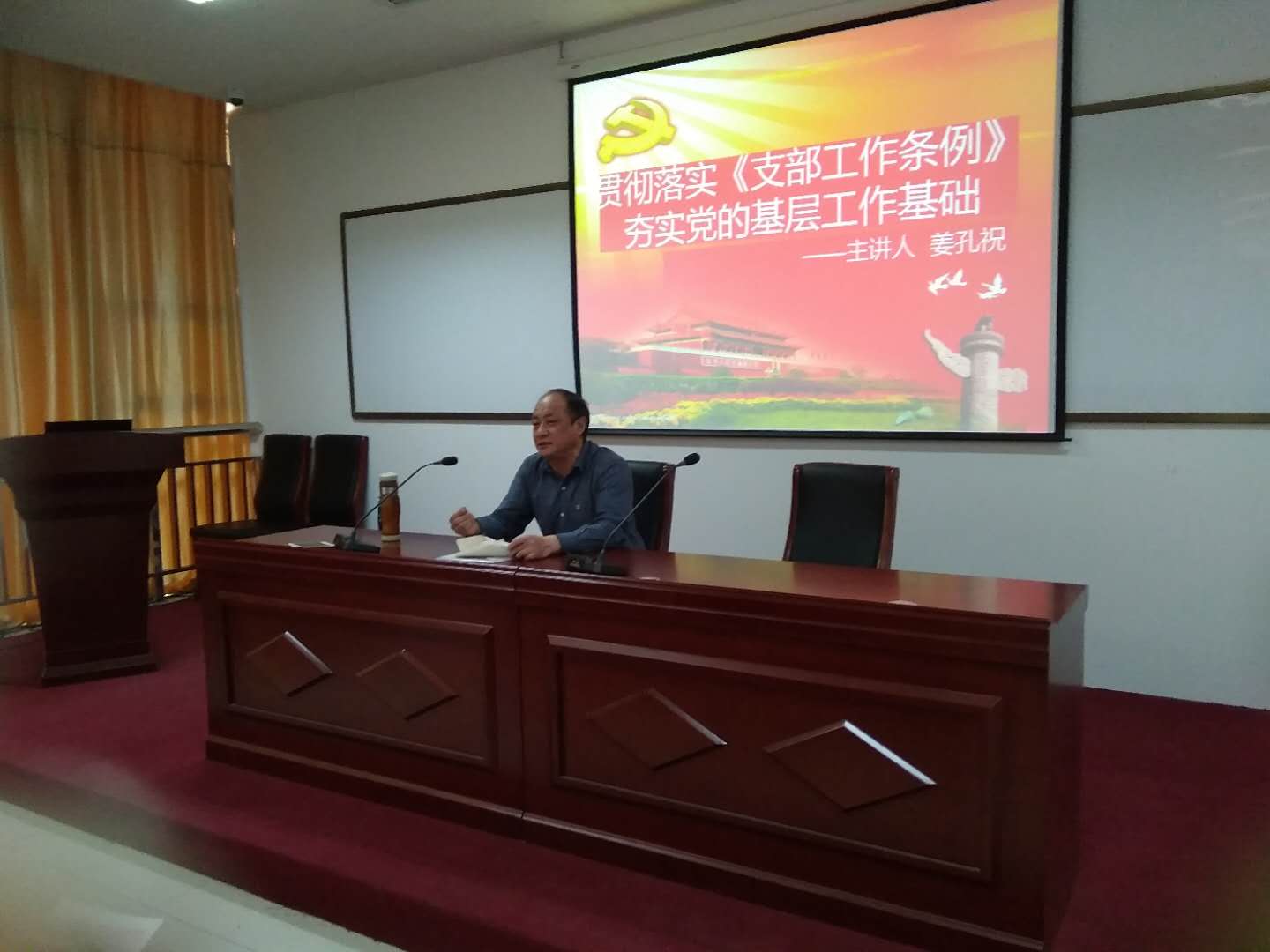 姜孔祝书记首先谈到如何正确认识理解《条例》的颁布实施,要求各基层支部以此为契机,全面提升自身的组织力、号召力、整合力和战斗力。强化政治功能,自觉担负起教育、管理、监督党员和组织、宣传、凝聚、服务群众的职责。其次,从先进、为民、善治、改革、民主、法治、廉洁、奋斗、开放、文明等十个方面,描绘了新时代中国共产党应有的形象。最后,他强调开展支部工作应该妥善处理的几个关系,包括继承优良传统与不断改革创新的关系、党务工作与业务工作的关系、工作与学习和做人的关系等。