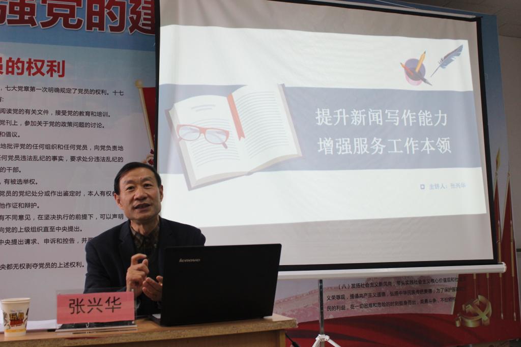 张兴华以《提升新闻写作能力,增强服务工作本领》为题,分新闻写作究竟离我们有多远、新闻写作为什么“爱你不容易”、如何让新闻写作“可爱起来”三个主题展开论述,结合当前网文写作比赛的相关需要,生动细致地讲解了辅导员如何写好新闻稿,如何做好宣传工作和学生思想辅导工作。