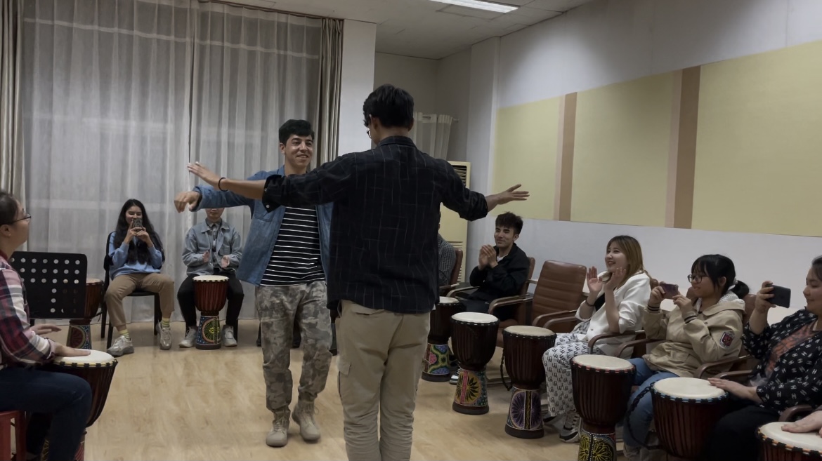 活动伊始,孙丽老师为大家讲述了减压的重要性,介绍了各类减压方法,讲解了非洲鼓伴奏中常用的“万能谱”,演示了高、中、低音的拍打方法以及拍打组合。之后带领少数民族师生体验了“少年”、“成都”以及“一瞬间”等歌曲的非洲鼓拍打,期间还穿插了“中华小曲库”猜歌名互动环节。整个学习过程中,大家热情高涨,附和着歌声,有节奏地拍着鼓,感受节拍的魅力。一曲《新疆吆喝》更是将活动气氛推向了高潮,同学们载歌载舞,好不热闹,脸上洋溢出幸福的微笑。