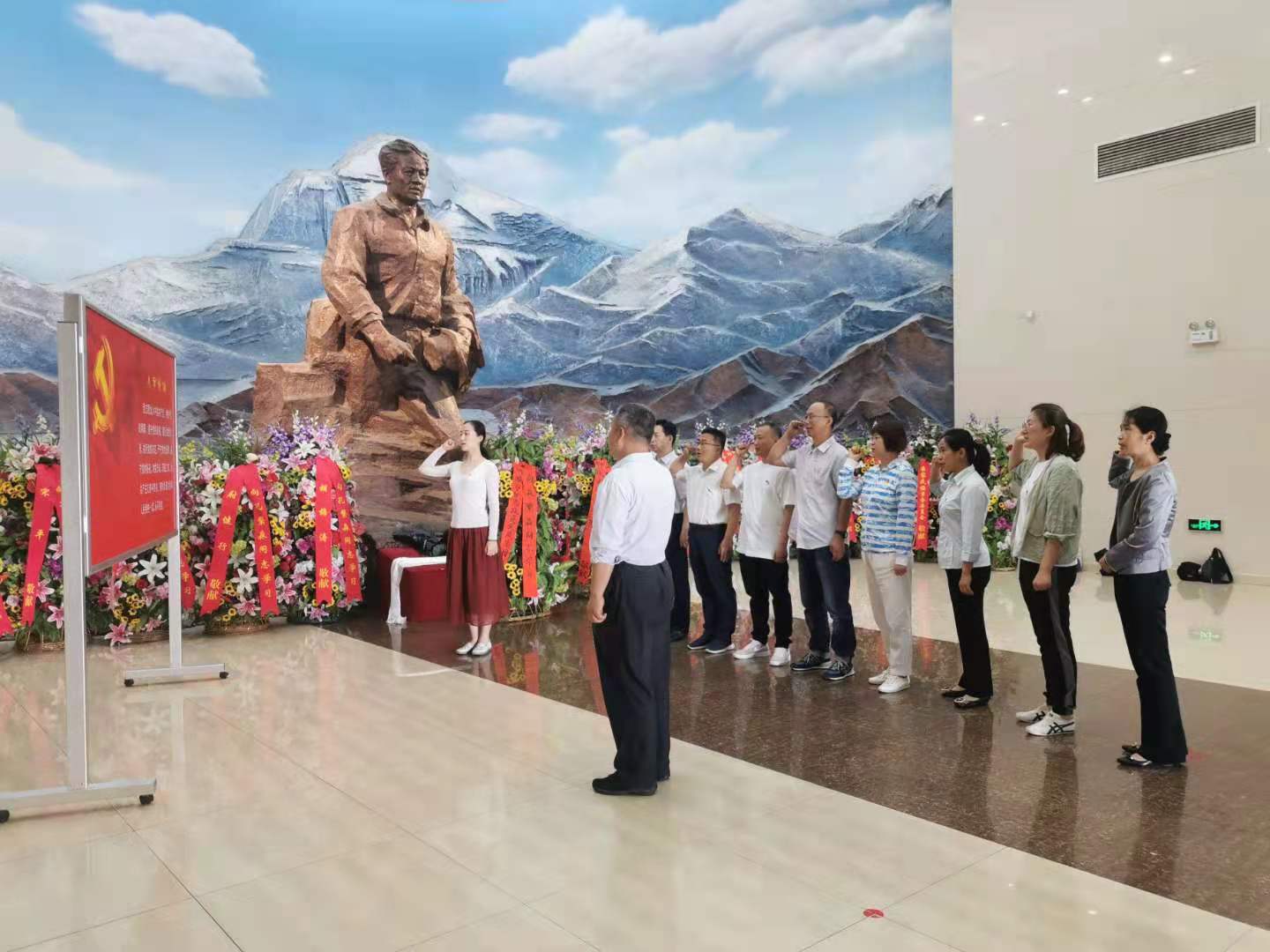 走进纪念馆序厅,孔繁森像屹立在蓝天白云映衬的冈仁波齐峰背景画前,展现了孔繁森在雪域高原上顶风冒雪跋涉前行的情景,令人油然而生战胜一切艰难险阻的感染力,全体党员面向孔繁森像默立鞠躬,向孔繁森同志致敬。