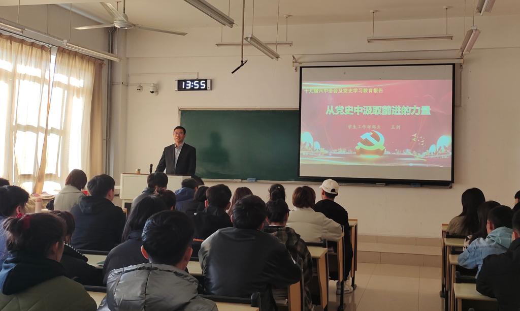 王剑从“深入学习党的十九届六中全会精神、开展党史学习教育的背景和目标要求、大学生要从党史学习中坚定理想信念、担当历史使命走好新时代长征路”四个方面进行了讲解。王剑为同学解读了十九届六中全会精神,重点解读了《决议》主要内容和“两个确立”的重要意义;介绍了开展党史学习的历史背景,并向同学们提出了开展党史学习的目标和要求。王剑激励同学们在党史学习中坚定理想信念,担当历史使命,传承好红色基因,奋发成才,走好我们这一代人的新时代长征路。讲座结束后,王剑与同学们亲切交流,叮嘱同学们期末考试在即,要重视数学和英语的学习,学好基础知识,为进入专业学习夯实基础。