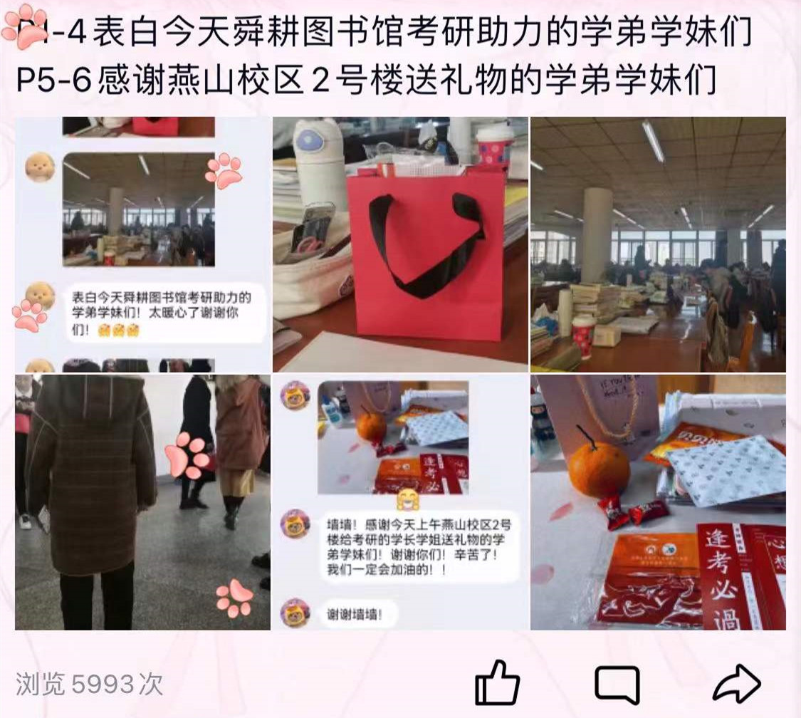 “早上收到了学校的加油礼包,真是太暖心了。我们一定积极备考,以最好的状态迎接即将到来的考试”“在走廊背书回来,就看到桌子上放了礼物,红彤彤的袋子最能温暖人心,谢谢学弟学妹,谢谢学校”“最近压力比较大,真的被暖到了,心里平坦很多,爱山东财大”……收到礼包的同学纷纷感言,不约而同在朋友圈晒出贺卡和礼包,表白墙里的评论和点赞爆棚。