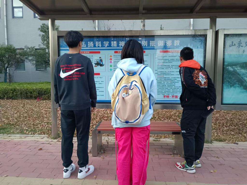 11月初,章丘区委政法委统一制作反邪教宣传展板,在圣井校区三个班车站牌张贴,路过学生纷纷驻足浏览。