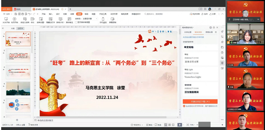 11月24日,实验教学中心举办党的二十大精神专题宣讲会,校宣讲团成员、马克思主义学院院长徐莹教授应邀作题为“赶考路中的新宣言:从‘两个务必’到‘三个务必’”的专题报告。会议采取线上方式进行。
