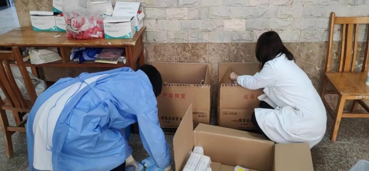 短暂的休息后,他们又开始准备第二天核酸采样的物资:分装采样管、采样器、防护装备、消毒用品等物资。
