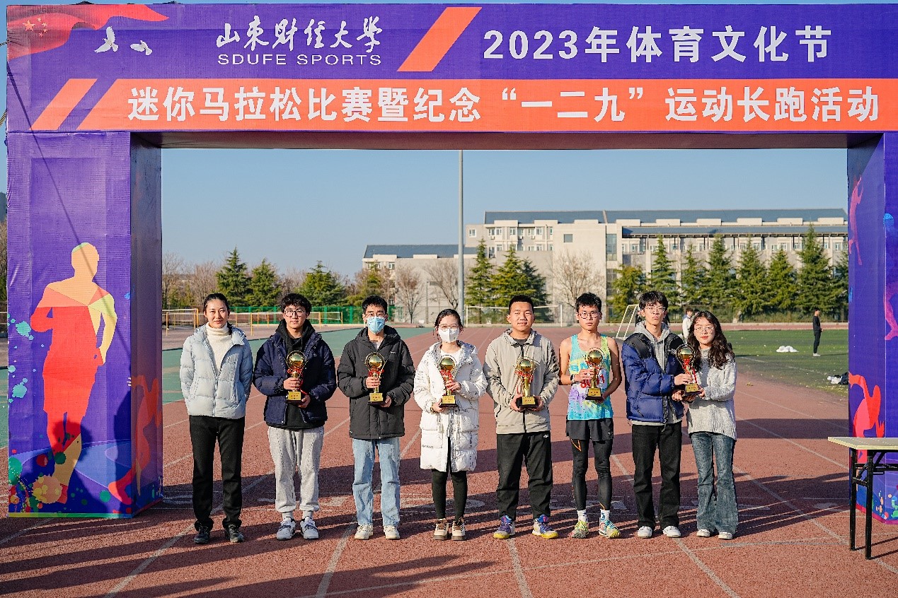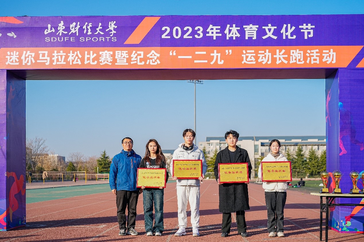 12月7日,山东财经大学2023年体育文化节迷你马拉松比赛在圣井校区顺利举行。本次比赛由校学生工作部、校团委、教务处、体育学院主办,迷你马拉松竞赛组、校学生会协办。校团委副书记邢夏子、体育学院副院长韩夫苓到现场为获奖学院颁奖。