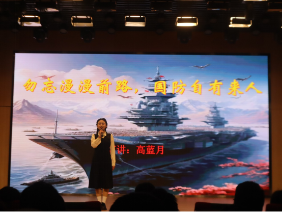 周楠、高蓝月以“‘青春·信念与担当’国防强则国家安”为题,开启了第一篇章的宣讲。周楠的《心中的国防蓝,永远的中国红》宣讲讲述了自己应征入伍的经历和感想;高蓝月的《勿忘漫漫前路,国防自有来人》宣讲向同学们讲述了革命前辈们的艰苦奋斗和新中国的来之不易。