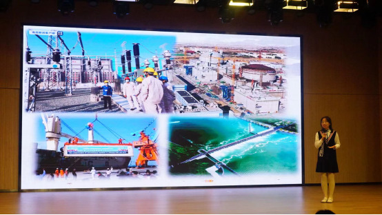 安俊豪、苗同洲、邓荃文讲述了古丝绸之路的来源、影响和“一带一路”倡议的关系,以孟加拉国、巴基斯坦等国家的发展、变化为例,展示了十年来“一带一路”对世界的贡献;于诗凝讲述了我校23届毕业生于骁麟在非洲参与“一带一路”建设的故事。