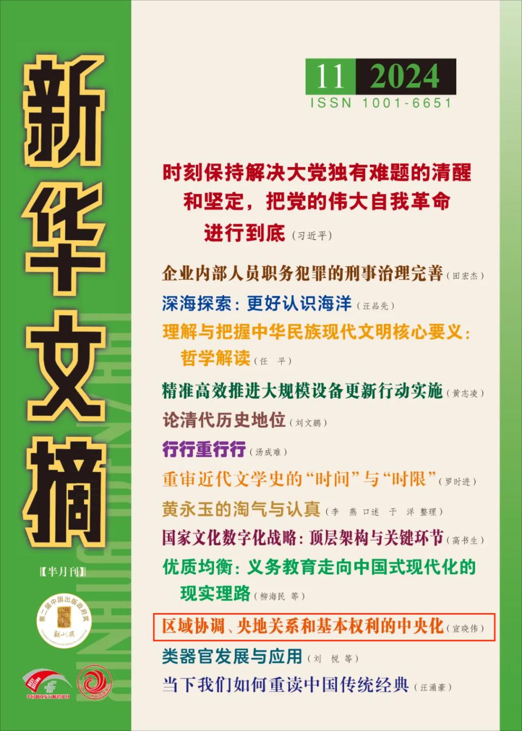 近日,《经济与管理评论》2024年第1期刊文《区域协调、央地关系和基本权利的中央化》(作者:宣晓伟,责任编辑:王瑞)被《新华文摘》2024年第11期全文转载,并作为封面文章予以推介。这不仅是对期刊刊文质量的高度认可,也是创刊四十周年的一份珍贵献礼。